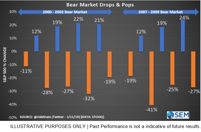 This has been the most often asked question we’ve seen from clients and advisors alike. While the signs are there that the bear market started in 2018, we won’t know until we all have the benefit of hindsight when it began. One of the first things I learned when studying market history is the most furious rallies come inside a bear market. This chart illustrates the swings from the last two bear markets. Every trading day is represented. It is easy to forget all the big rallies that suckered clients (and advisors) into believing the worst was over.