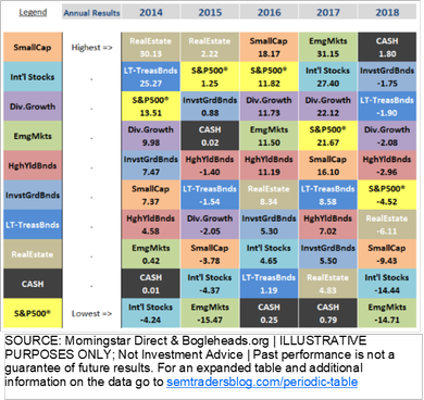 The table to the left plots the returns for a wide range of index funds representing nearly all investment segments available. The only segment that made money in 2018 was CASH (the worst performing asset in both 2016 & 2017.)