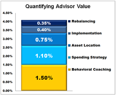 Even the “passive” fund company Vanguard conducted their own study of client accounts and came to a similar conclusion. Vanguard’s study showed an advisor can add 2.3% to 4.1% annually to their clients’ accounts through a variety of services. By far the largest contribution is the 1.5% Vanguard identified as “Behavioral Coaching”.