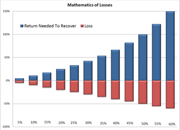 If you lose 50% of a $100,000 investment, to recover you have to make $50,000 – a 100% gain. When the losses are low, the gain needed to recover them are also low. For instance, a 15% loss requires an 18% gain to recover. Right around the 20% mark, the gains needed to recover begin to escalate. If we lose less, we get to risk less to make up for the losses. So not only can we keep our emotions in check by minimizing losses, we have math on our side.