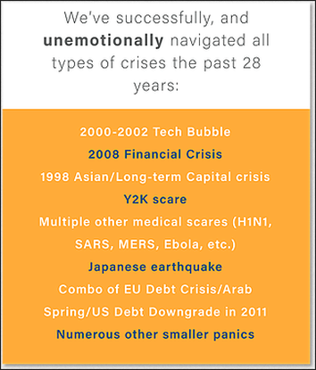 1.) Clearly the stock market and our economy has never faced a crisis like we are right now. Since our founding in 1992, SEM has been through plenty of "unprecedented" events. The "cause" of the panic may be different, but the human reaction is not.