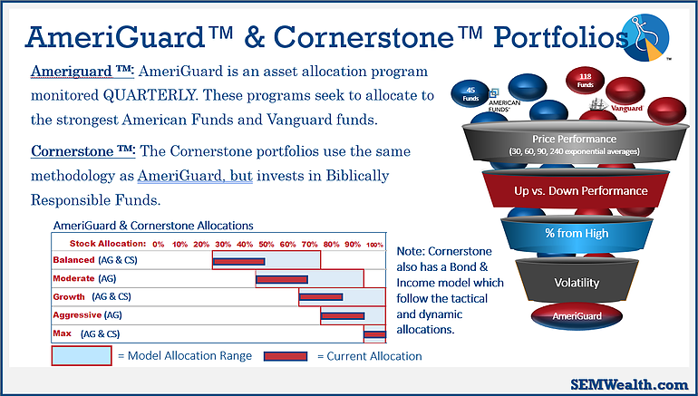Strategic* Models: (AmeriGuard Balanced/Growth/Max & Cornerstone Balanced/ Growth/Max) -- these are designed to be the longer-term holdings. We add an asterisk to the strategic description because unlike other offerings from the big name firms, these models will have a more focused core instead of a static blend of a bunch of various asset classes. More importantly, there are two trend indicators which will reduce (or increase) stock exposure (except for the Max models, which are always fully invested in stocks). It is psychological important at times like this to know the models can make adjustments based on bigger picture market trends.