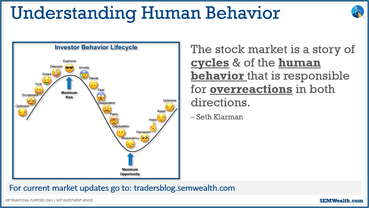 This quote from Seth Klarman is used in almost all of our presentations. Humans tend to overreact when things are really great and when things get really bad. We'll see both humans and eventually the stock market go through these emotions.