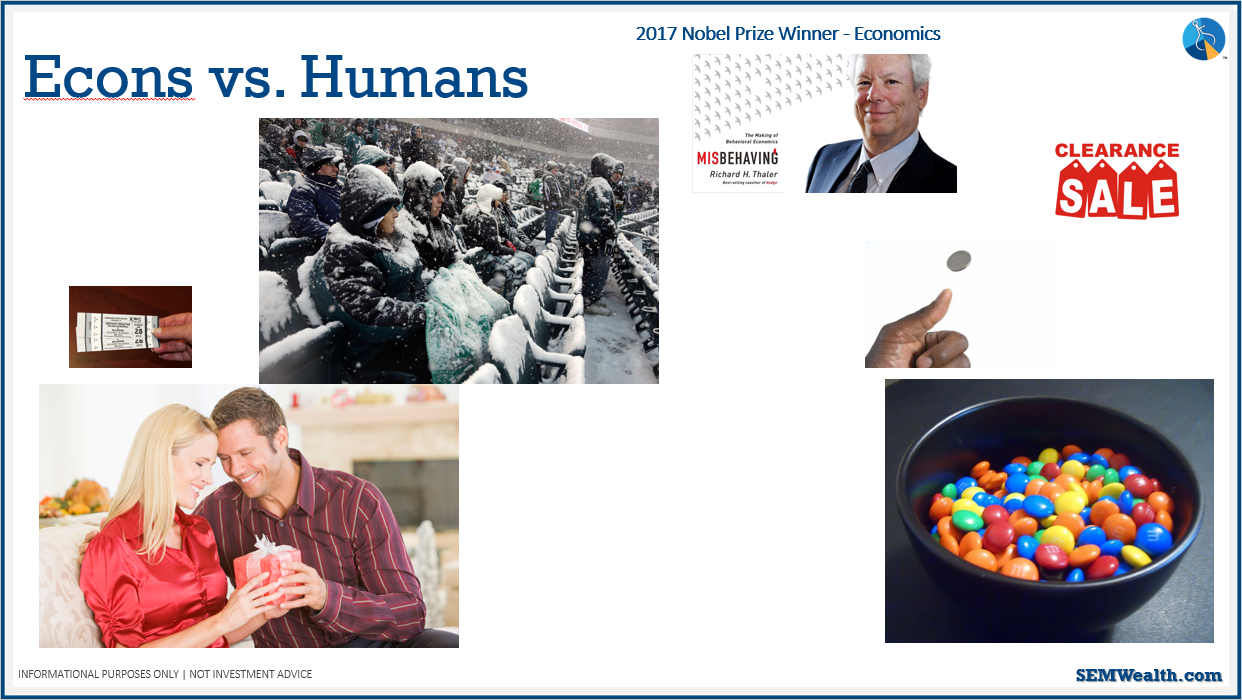 In Richard Thaler's book, Misbehaving, he determines why economists models don't work – they make assumptions that humans are perfectly rational, when in reality, humans are irrational. Here are some things Richard Thaler says people aren't good at doing: putting a value on things and how we spend money; understanding odds/percentages.