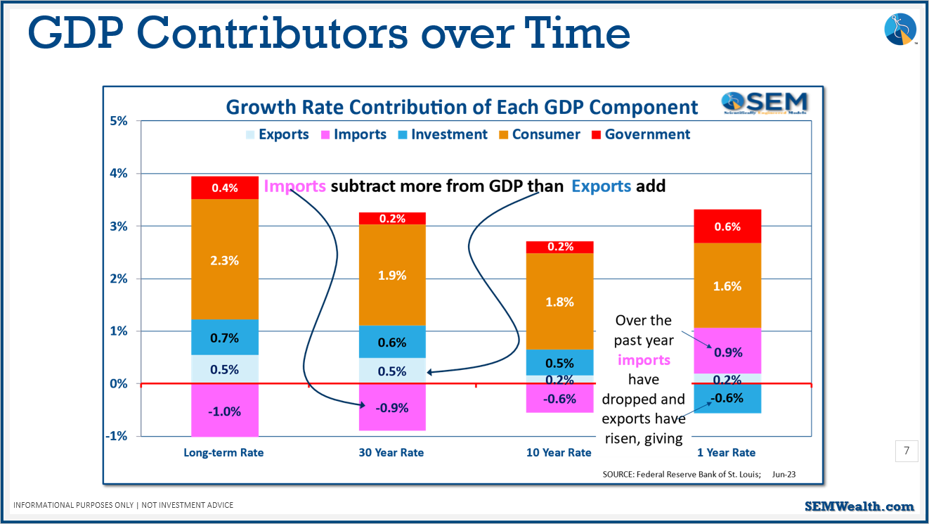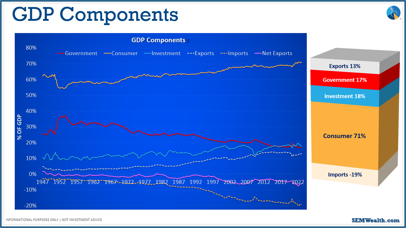 These charts break up the different components of GDP. You can see that by far the largest contributor to economic growth is consumer spending (71% economic output overall). Therefore, we should focus largely on consumer spending without losing track of the other components. In the breakdown on the right, it shows that our net exports is actually negative – our trade deficit, which we will talk about more later.