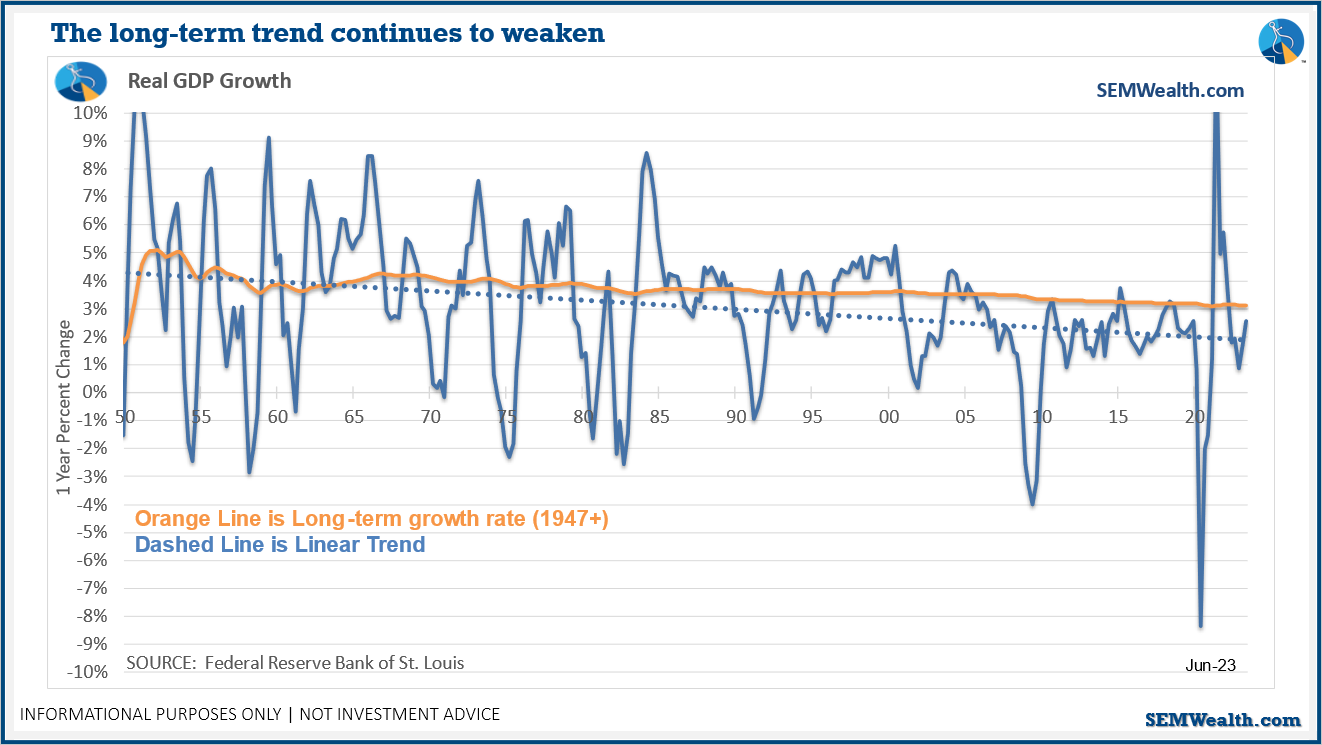 Over the last 23 years, we've rarely eclipsed the long-term average growth rate (the orange line in the chart).