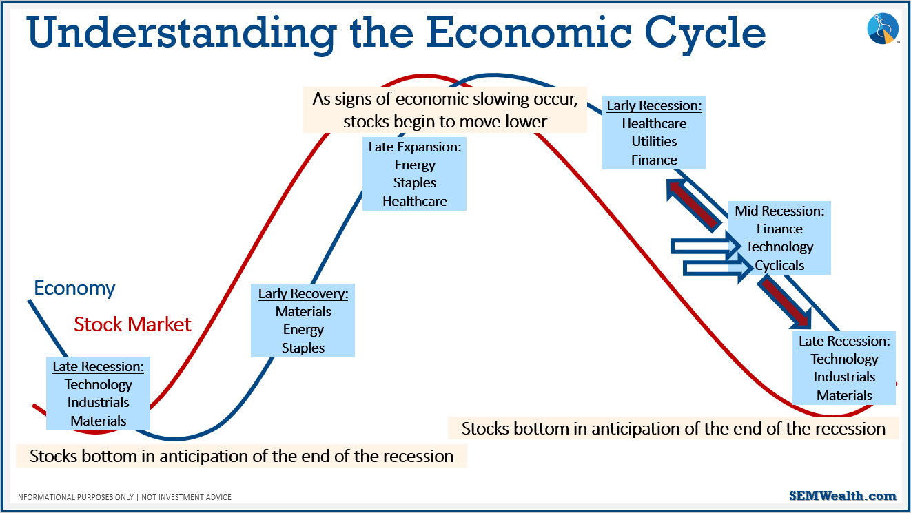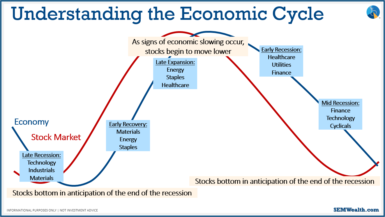 How do we use all this in our investments? Stock market is a forward looking mechanism – it's trying to guess which way the economy is going and allocate assets to the sectors that they predict are going to do well. The stock market tends to turn before the economy does. The slide above breaks down the economic cycle and what sectors tend to be impacted.