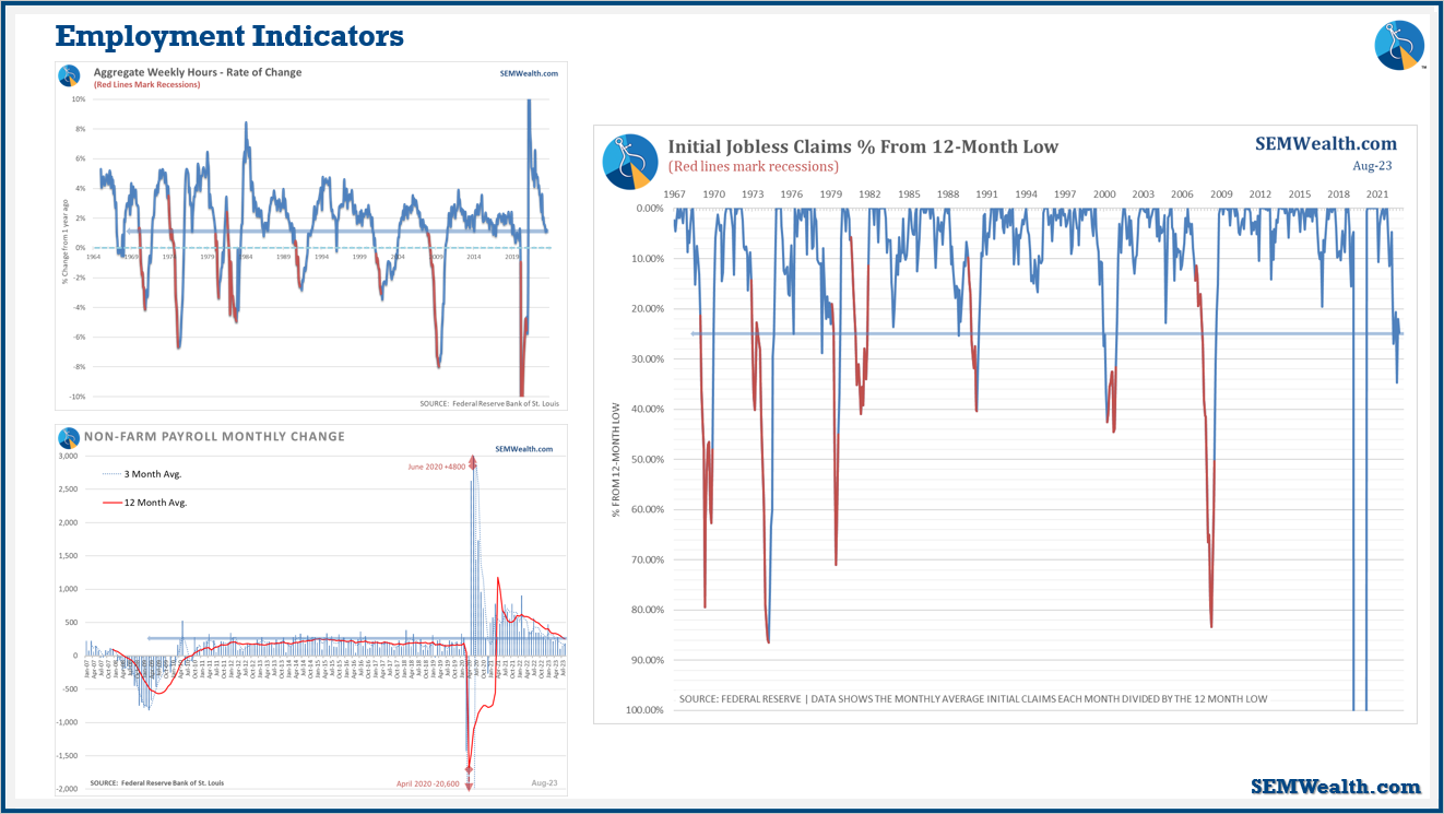 One of the best drivers and indicators of potential growth is the aggregate weekly hours index (top left). It's easier to add or cut people's hours than it is to hire somebody and then have to either lay them off or lay them off and have to hire them back. This chart shows that employers have been cutting hours recently. The chart on the bottom left shows payroll. Right now, payroll has been going down/flatlining, but it's still positive. For now, jobs are still improving. Jobs are what we call a coincidence indicator; meaning, they'll start dropping when we're already heading into a recession. Therefore, it's not that great of an indicator if you're trying to predict where the economy is going. What is a good predictor is shown in the chart on the right: initial jobless claims. As jobless claims go up, that's bad; however, our brains tend to see things going up as a positive. I flipped this chart around to help with how our brains work. Right now, we're in an area where jobless claims are 20% higher than they were twelve months ago – this is a sign of economic strain.