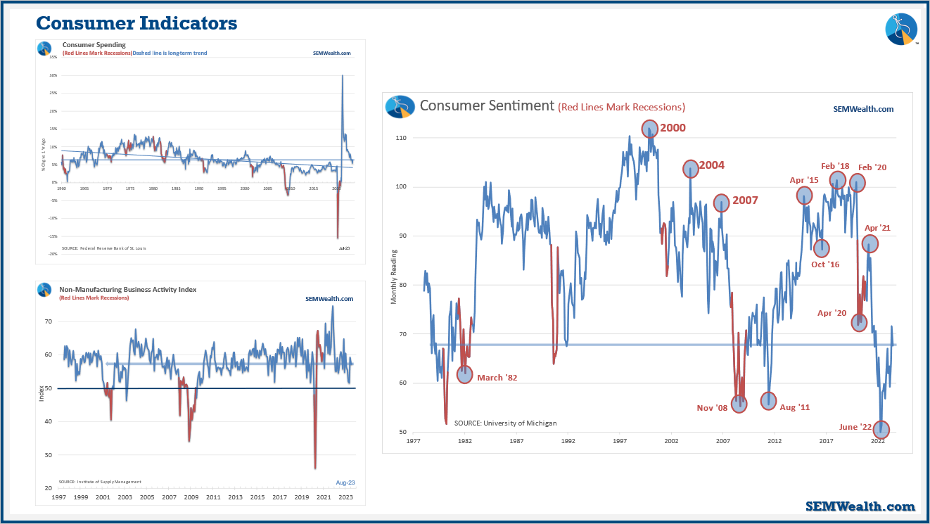 Consumer spending is the largest driver of our economy, and it's continuing to blow away expectations (see top left). What will get people to stop spending money? Probably some economic strain. We've turned into a service economy. You can look at where consumers spend their money, and it's on services. The indicator shown in the bottom left basically tells us if it's over 50, it's an indication of expansion; if it drops below 50, it's an indication of a contraction. Right now, we're still strongly in expansion territory.