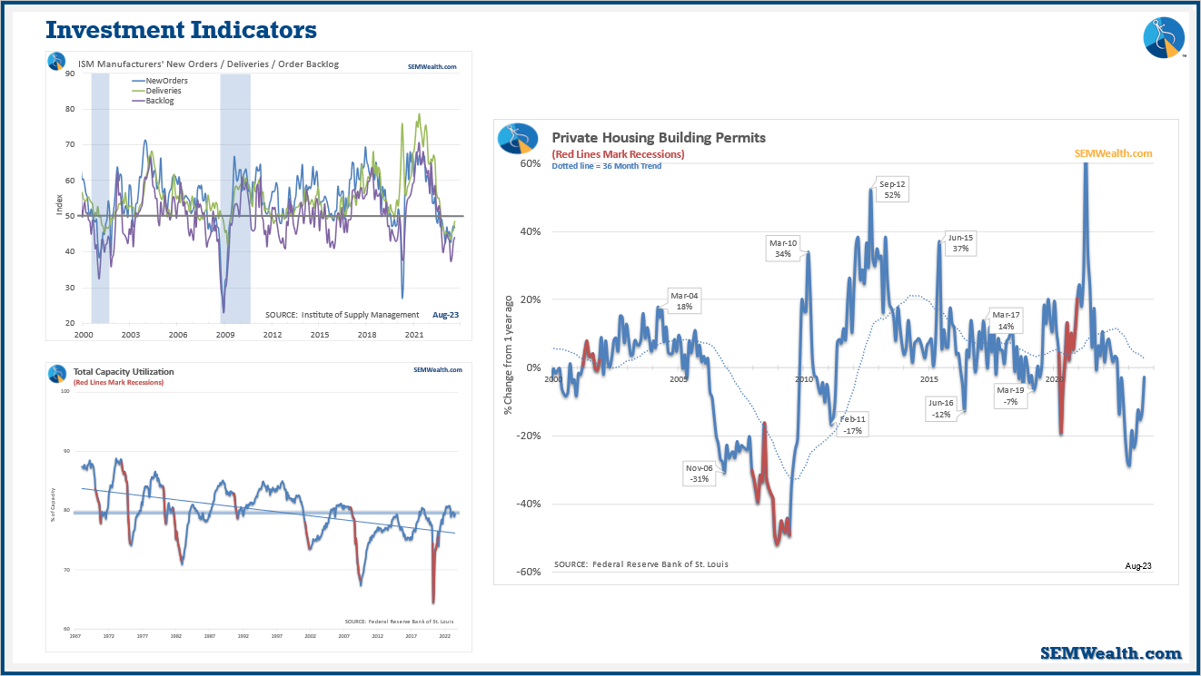We're not a manufacturing economy anymore, but it's still about 20% of our economy. Right now, we're going through a trend where we're reshoring jobs and production, so manufacturing is going to become a bigger player. All of our manufacturing indicators (shown in the top left), are pointing to weaker growth – in this chart, any number below 50 is negative. Capacity utilization (bottom left): are we investing in more growth? After COVID, we saw a growth, but now it's starting to flatline to the point of manufacturers are not using their full capacity.