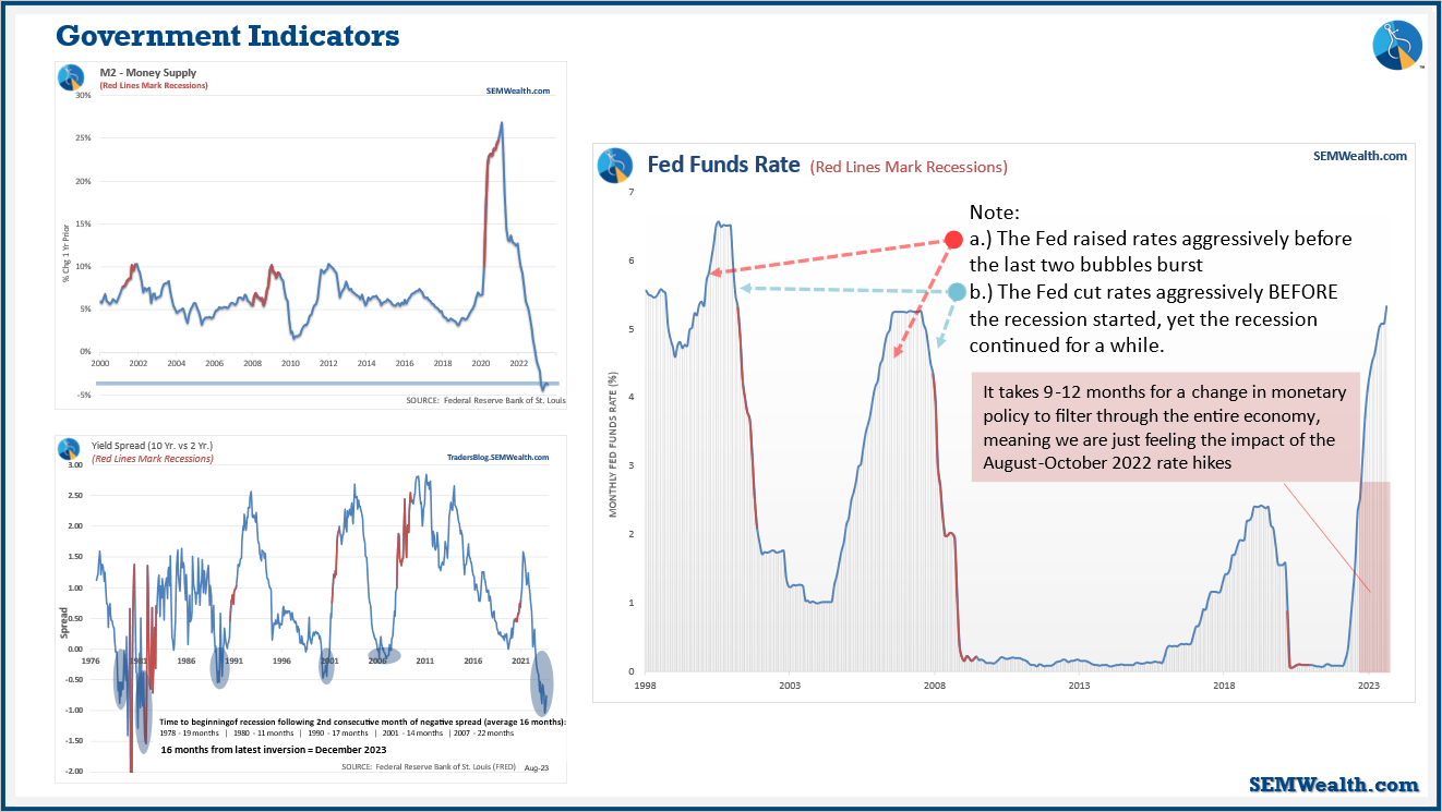 Government can be split into two things, but I'm mainly going to talk about the Federal Reserve because they can tweak the economy faster than Congress can. First off, money supply is shrinking (top left) because we had such high inflation that the Federal Reserve is trying to take money off the table. The yield curve (bottom left) is really important to understand. When the yield curve inverts, it starts to slow down the economy and it gets difficult to get a loan because banks aren't willing to take risks. There's a 16 month lag from the time the yield curve inverts two months in a row to when we get into a recession. Looking back, that means the end of 2023 is when we're heading to a recession (based on this data).