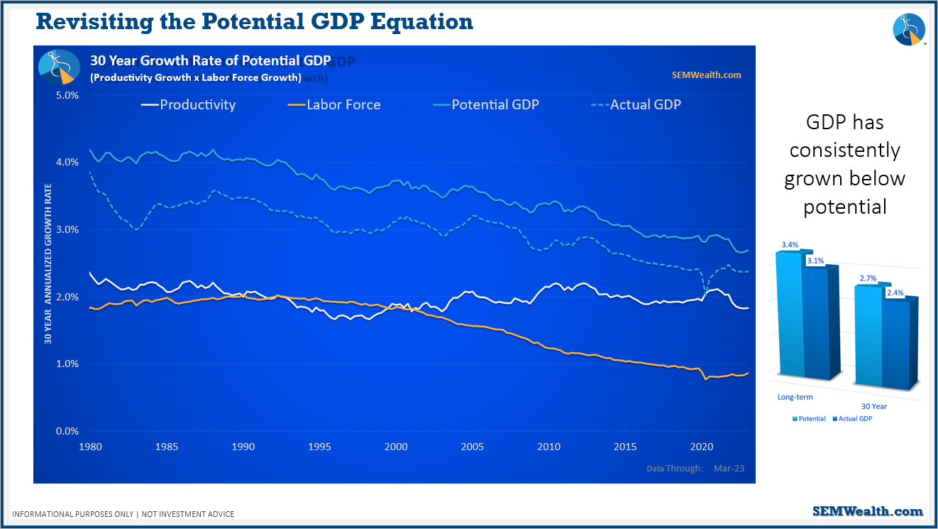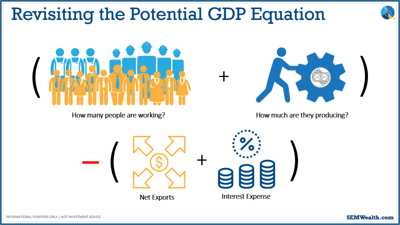 This is how we need to change the potential GDP equation. If we run a trade deficit and budget deficit where we have to pay interest, money leaves the U.S. to other countries to pay for their goods/services or to pay investors who loaned us money to finance our budget deficit. This is why we've lagged long-term potential GDP growth – our two deficits.