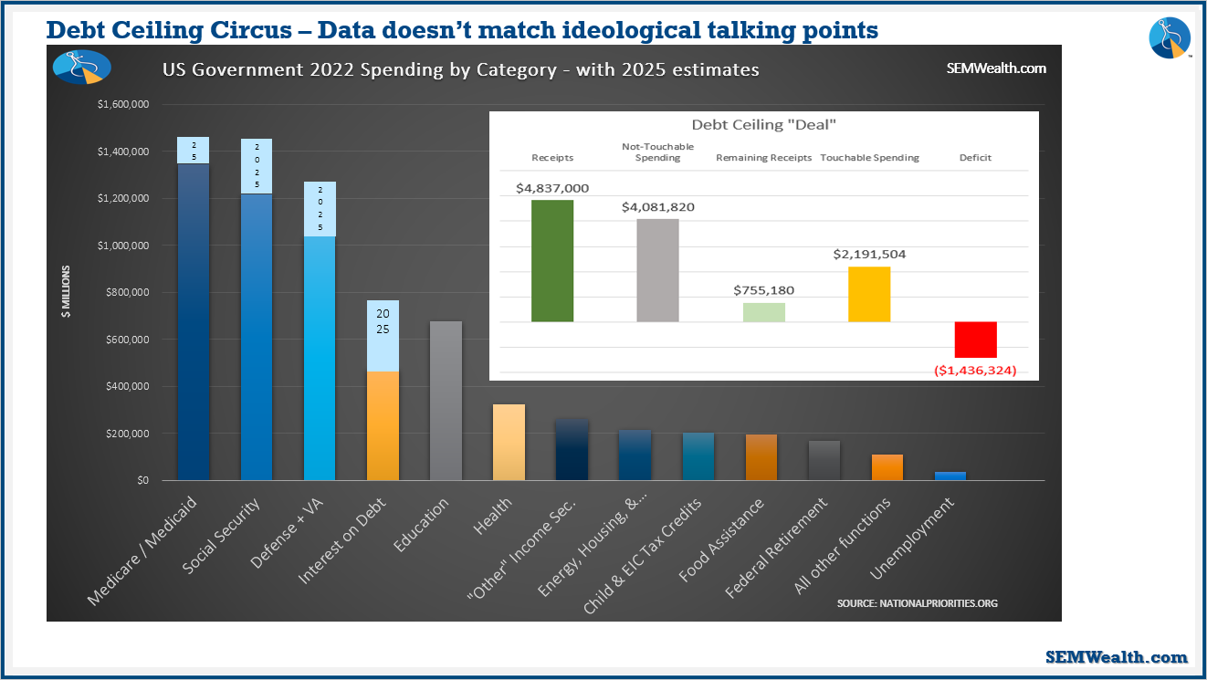 The three "untouchables" are Medicare/Medicaid, social security, and defense spending (+VA benefits). This chart shows why this is a problem – the untouchable money adds up to $4Trillion while we're only bringing in $4.8Trillion. Social Security and Medicare are a problem because they don't put more people to work and they don't make people more productive; therefore, it's a drag on economic growth.