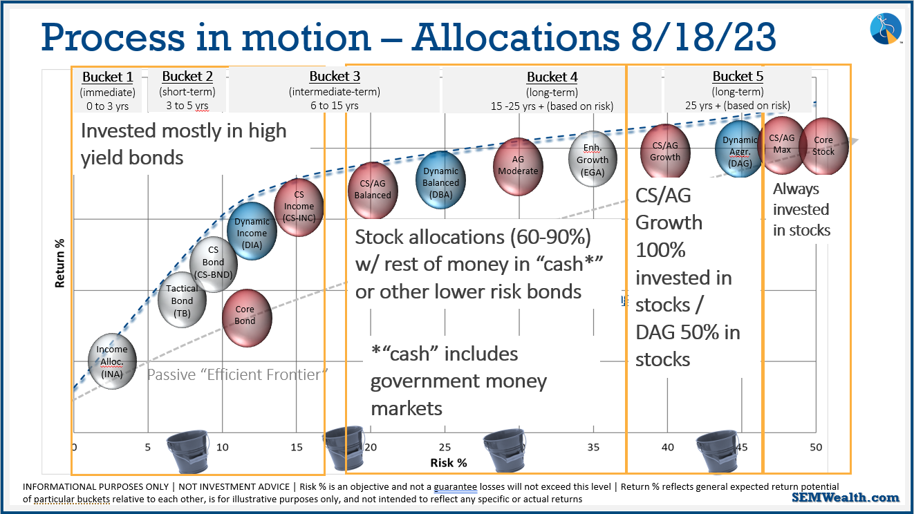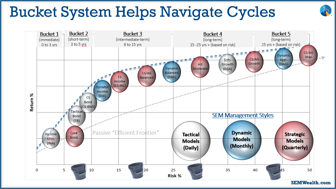 We use a bucket system at SEM to break up money based on when you're going to be spending the money. We have a lot of investment options. How we allocate those comes down to your financial plan, cash flow strategy, and your personality.