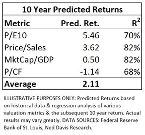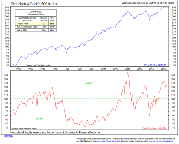 Last week Ned Davis Research updated a chart that looks at another way to set expectations for the market — by looking at how much of American’s Disposable Income is already invested in the market. NDR’s research confirms what we logically understand about the market — if households are underinvested there will be a strong inflow to stocks, leading to above average returns. If they are fully or overinvested in stocks there is little money left to flow into stocks and we are likely to see lackluster returns. Based on this research, the expected returns for stocks is now around 0%.