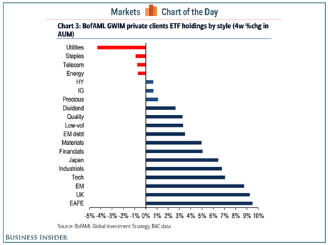 What is interesting is how we are seeing money flowing into risky assets (apparently the S&P 500 isn’t risky enough). We mentioned on Monday how Bank America Merrill Lynch (BAML) is calling this a “melt-up”. They define a melt-up as a rush of money out of safer assets and into riskier ones not because of fundamental improvements, but rather out of fear of “missing out.” This chart from BAML shows the % change in assets over the past 4 weeks.