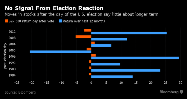 Bloomberg is telling us to not read anything into the reaction to the election as it has only had a 50/50 success rate in predicting the returns for stocks the next 12 months.