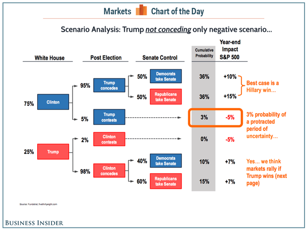 A Trump victory. Estimates are that the market would decline by 5-7%, mostly because of increased uncertainty. Many market participants believe that Trump economic and regulatory policies would be market-friendly. (CNBC)