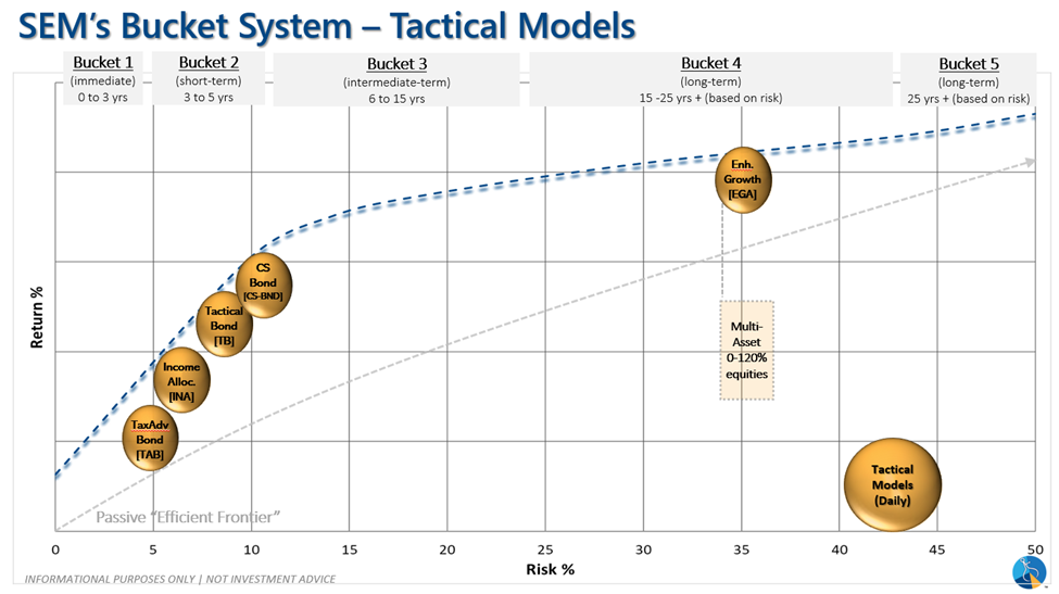 Here is our bubble chart showing the Tactical Models that we offer. For BRI, we offer Cornerstone-Bond. Cornerstone-Bond utilizes the same trading strategies as our popular Tactical Bond model. Our Tactical programs are monitored daily. They study the trends in the market with a primary focus on moving to lower risk asset classes when risks are high. Due to their focus on risk management, tactical programs will not participate as much in rising markets. Cornerstone-Bond is a good option for people who don't like to take big risks and/or have a shorter time horizon (when they need the money). While you won't receive as large of a return as our other management styles when the markets are up with Cornerstone-Bond, you also won't lose as much money when the markets are down.