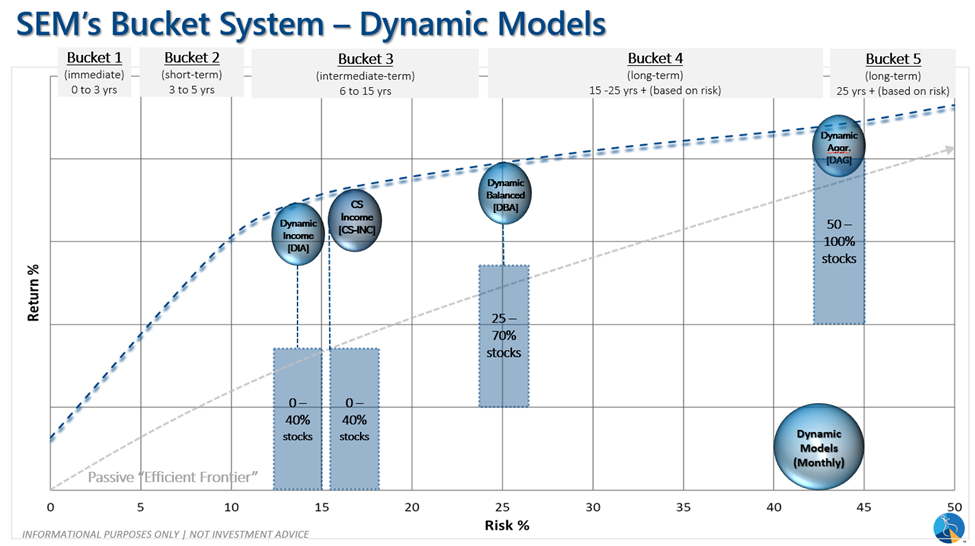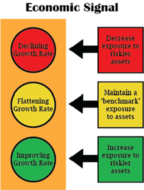 This is our bubble chart showing the Dynamic Models that we offer. For BRI, we offer Cornerstone-Income, which is managed in a similar fashion to our Dynamic income model. Our Dynamic Allocation programs are monitored monthly. These programs start with a core asset allocation and then increase or decrease exposure based on SEM's Economic Models. Compared to Cornerstone-Bond, Cornerstone-Income will have slightly more risk as it will utilize dividend stocks at various times throughout the economic cycle. However, that gives you the potential for more reward if the markets are up. Below you'll see a graphic of our economic signal for when we'll increase or decrease exposure.