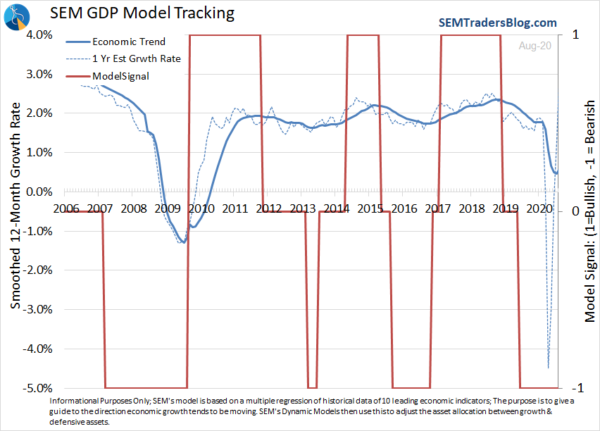 Our economic model predicted the recession before anyone on Wall Street had uttered the word Coronavirus. It got defensive in early 2019 as the temporary boost wore off. It has remained negative throughout the recession. It is obviously not designed to see a 10% year-over-year drop that is met with trillions of dollars of stimulus from the Fed or Congress. Stock market participants took that as a buy signal and poured money into stocks, especially those companies who were benefiting from the nationwide lockdowns. We now have large cap stocks back to all-time highs with the economy likely to post another weak quarter.
