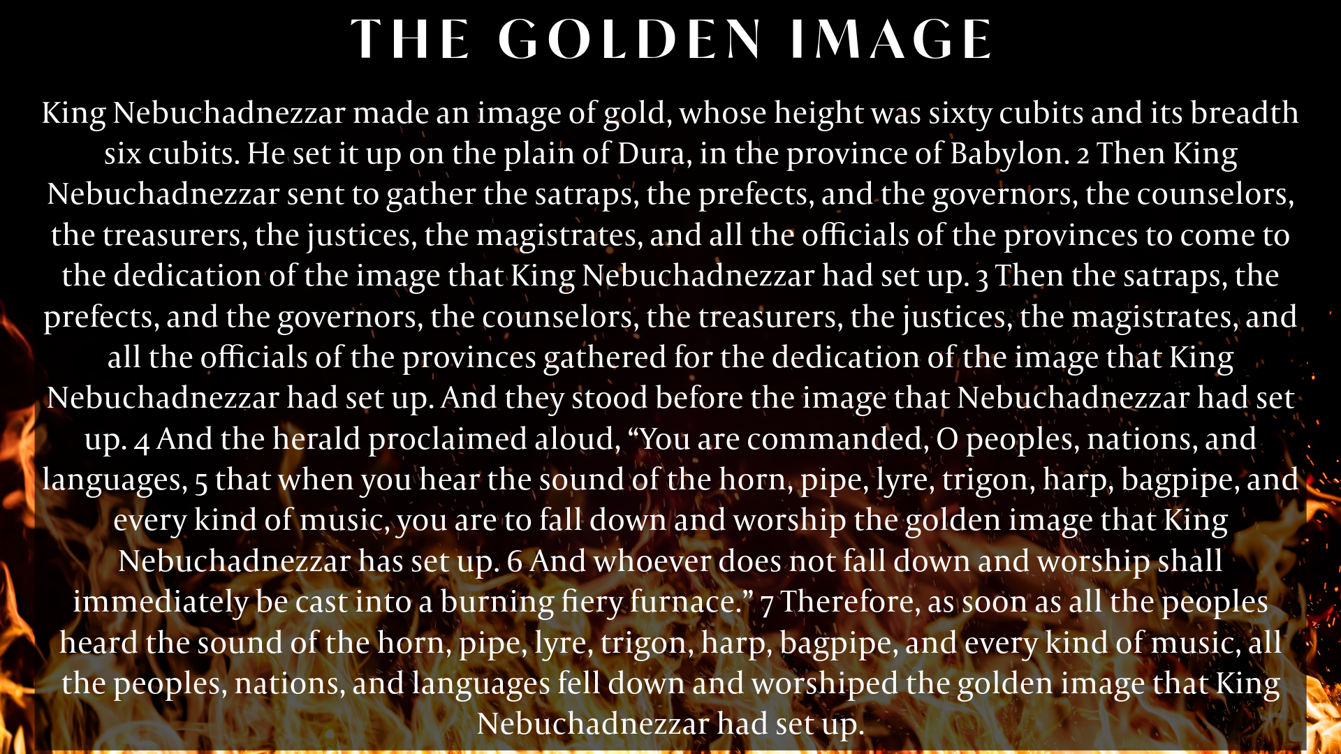 "Now if you are ready when you hear the sound of the horn, pipe, lyre, trigon, harp, bagpipe, and every kind of music, to fall down and worship the image that I have made, well and good. But if you do not worship, you shall immediately be cast into a burning fiery furnace. And who is the god who will deliver you out of my hands?" verse 15