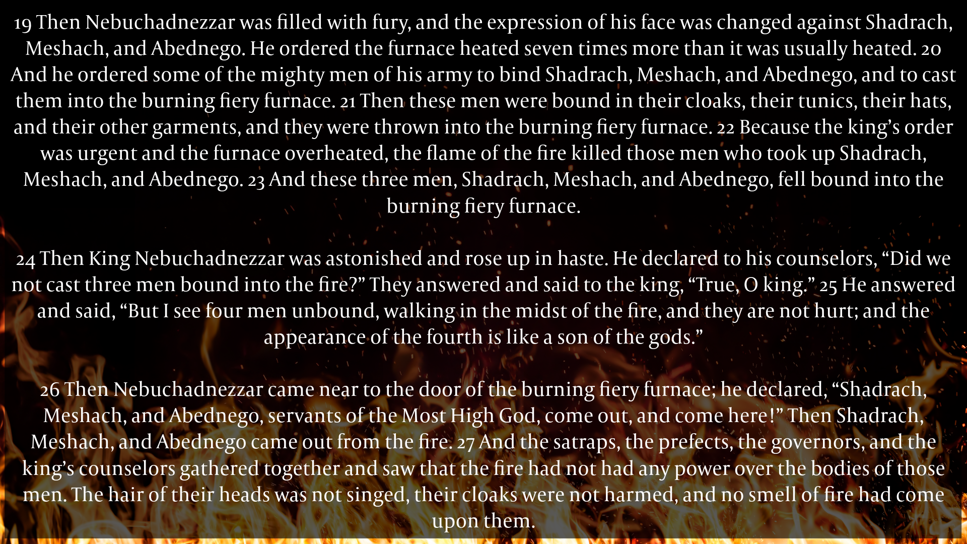 28 Nebuchadnezzar answered and said, “Blessed be the God of Shadrach, Meshach, and Abednego, who has sent his angel and delivered his servants, who trusted in him, and set aside the king’s command, and yielded up their bodies rather than serve and worship any god except their own God. 29 Therefore I make a decree: Any people, nation, or language that speaks anything against the God of Shadrach, Meshach, and Abednego shall be torn limb from limb, and their houses laid in ruins, for there is no other god who is able to rescue in this way.” 30 Then the king promoted Shadrach, Meshach, and Abednego in the province of Babylon.