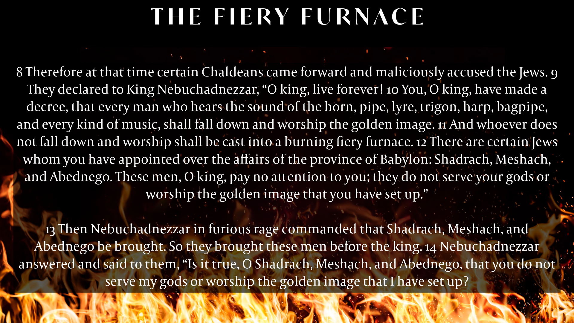 While most, if not all, of us haven't actually faced a life-or-death scenario in regards to our faith, we have probably faced a situation where we had to risk our job, reputation, friendships, etc. in order to remain faithful to God. It can be difficult to remain faithful when we face pressure in a secular world. Hopefully this story of Shadrach, Meshach, and Abednego can be encouraging as they're devout followers of God living and working in a secular environment.