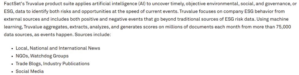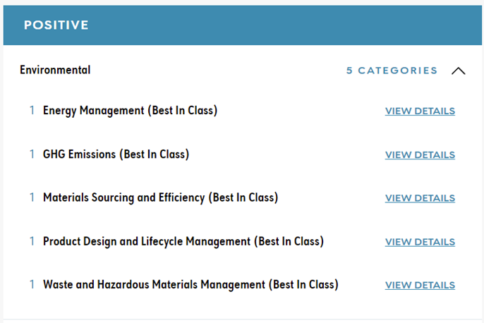 Inspire Insight is a screening tool we use. It helps identify companies who are "best in class" in various categories. Inspire uses Truvalue Labs for their rankings. Here's a short summary from their website that explains how Truvalue comes up with the scores: