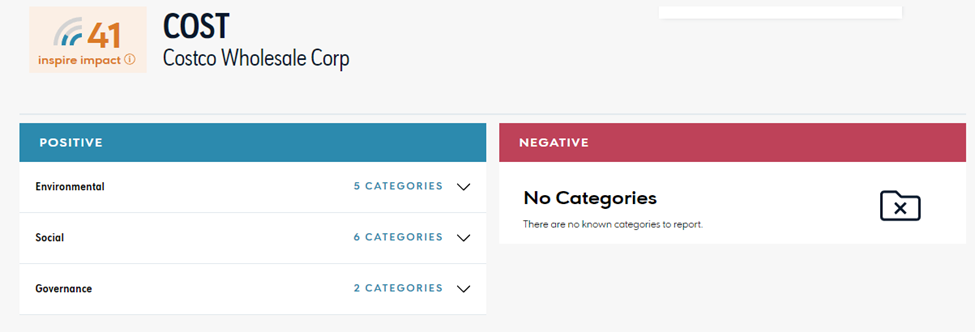 I'll walk through a few examples (positive and negative) of what Inspire Insight looks like when you search different companies. The first one we're going to look at is Costco. This is an example of a company we would embrace because it has a positive score (41). Inspire Insight then breaks down the score with both the positive and negative categories – in this case, Costco doesn't have any negative items against them.