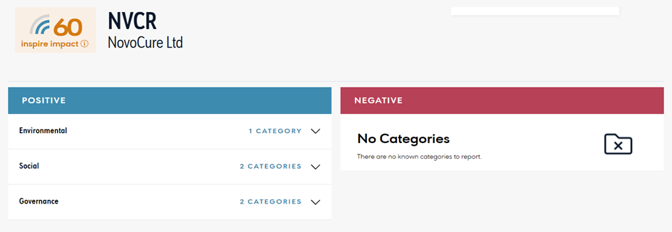 NovoCure is another company we embrace. They are a developer of a new cancer treatment; therefore, serving and valuing the lives of our neighbors. They have a higher score than Costco with 60. In the screenshot below, you can see they have less categories under environmental, social, and governance; however, they fall into a higher percentile in those categories which is why they have a higher score than Costco.