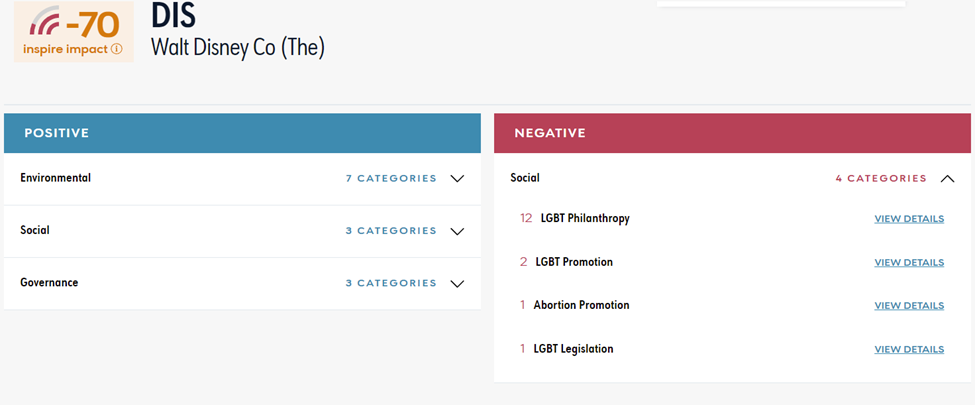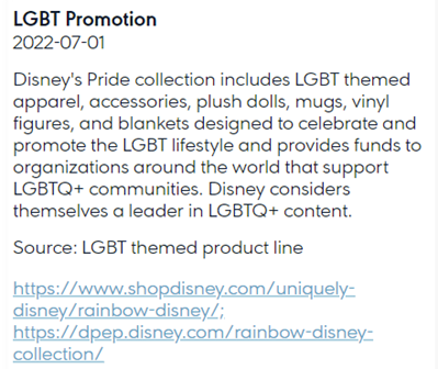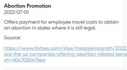 As you can see, the two major negative categories we seek to avoid in our BRI portfolios, LGBT and Abortion are both supported by Disney. Unlike the positive categories that are ranked by Truvalue, the negative side provides examples of the areas we're trying to avoid: