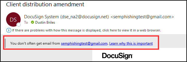Your email service might have the ability to configure a banner which warns you when you receive email from a sender you don't often receive email from. If you haven't configured this, I strongly recommend that you do. Notice the email below is using some trickery to try and make it look like the email actually came from DocuSign, but the banner shows the real sender address.