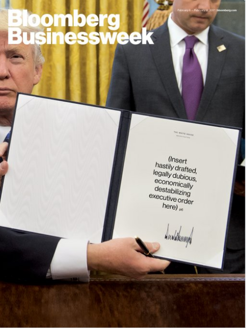 I’m seeing something akin to the “Is Sam unfriendly?” example Danny uses. All day long (especially on Bloomberg, who seems hell bent on proving why they were right in predicting Hillary Clinton would be the next president — the cover of the latest Bloomberg “Business”week is to the left) we see stories and discussions along the lines of “Is Donald Trump a bad (or dangerous) president?” Whether on purpose or not, the media is biasing our opinion of the President and our policies and this can become destabilizing to our country, the markets, and the economy.
