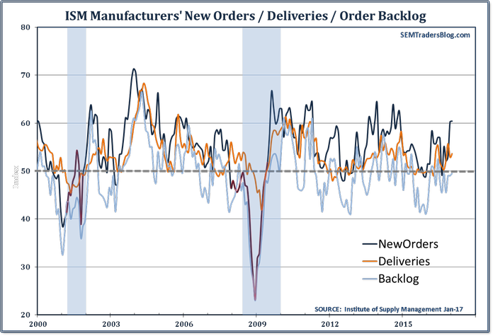 We didn’t learn much from the Fed’s meeting & subsequent statement yesterday, but we did get another key piece of evidence of the potential “Trump effect” when the ISM Manufacturing Index was released. This is one of my favorite leading indicators as it is available immediately after the month is over, giving us a good look at what the economy was like in the most recent month (keep in mind most economic data is not available for 2-8 weeks after the month is over.) In addition inside the ISM Manufacturing Index are some leading indicators of manufacturing activity. While our country does not make as much as it used to, it is still a good reading on the sentiment inside the economy. It is easy to understand — if businesses are optimistic they will order things. Here’s what the ISM “leading indicators” look like right now.