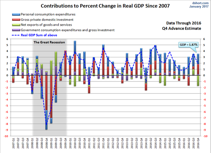 Please do not take my assessment as a political statement. Long-term readers know I’ve discussed many of the things President Trump is tackling as the STRUCTURAL issues that caused the “Obama” recovery to be the worst on record. Just looking at Friday’s initial 4th Quarter GDP estimate it is easy to see our trade deficit being a major drag on economic growth (as shown by this great chart from Advisor Perspectives).