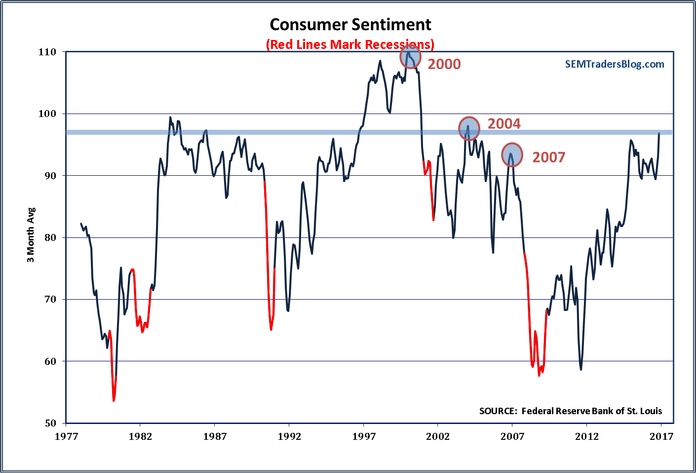 I put that blue line in there to show the current level of sentiment. Without siding with one political party over the other, the DATA tells us the election and inauguration of our new President (along with something rare — the same party controlling the White House & Congress) has ignited enthusiasm in our country for whatever reason. Consumer Sentiment has not been this high since 2004. This could be an important development and provide some strong winds at the back of our economy.