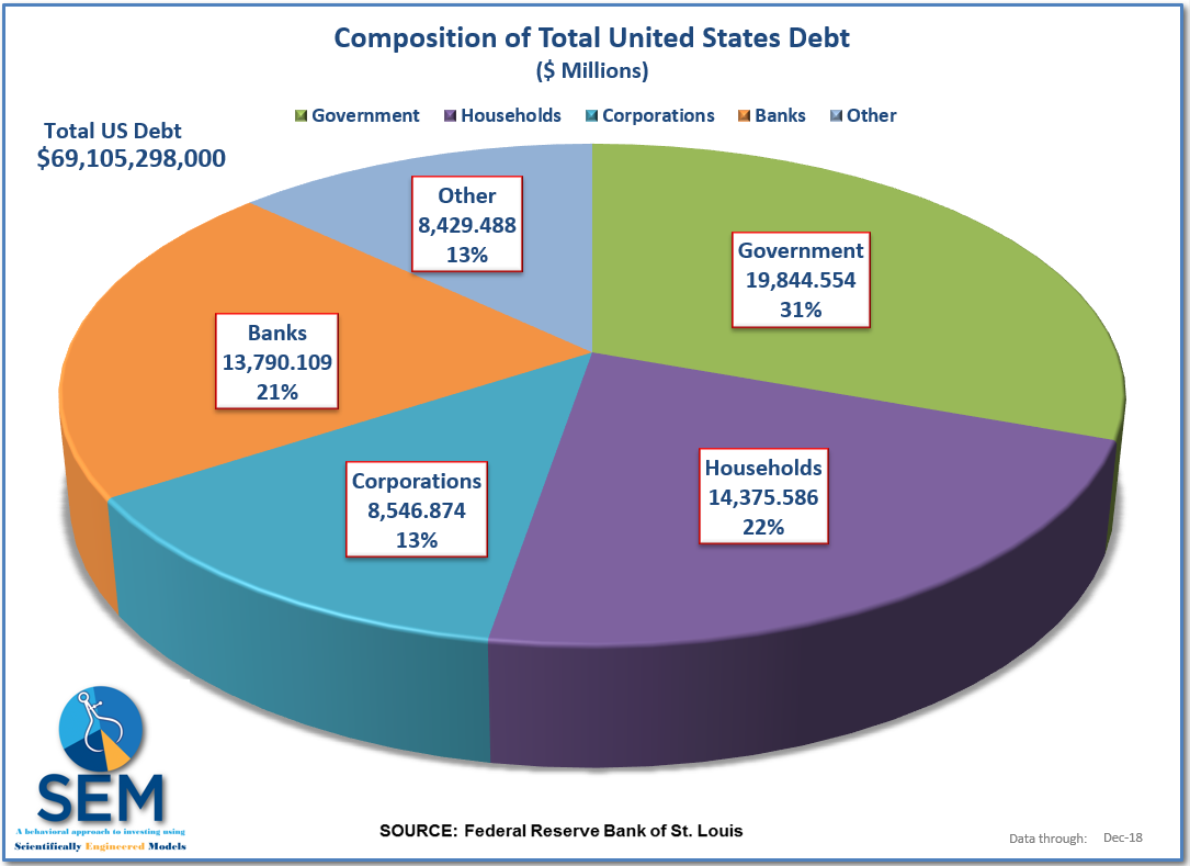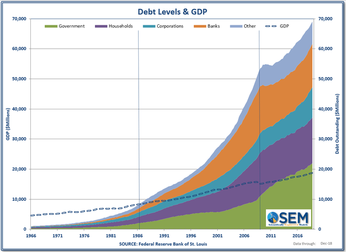 Remember, debt can be useful if used to fight a cyclical slowdown so long as it is paid back during the cyclical growth period. That hasn’t happened this time around meaning our country will not have the capacity to fight the inevitable slowdown that lies ahead. The 2017 tax cuts clearly did not pay for themselves in 2018 as the deficit expanded at a far faster rate than the economy. With the temporary boost from the cuts all but gone, the amount of debt necessary to grow the economy will be even greater in the years ahead. It’s not just the government borrowing money at a ridiculous rate. Corporations, households, and banks have all contributed. (Keep in mind this DOES NOT include the $19 Trillion unfunded Social Security liability or the $30 Trillion unfunded Medicare liability)