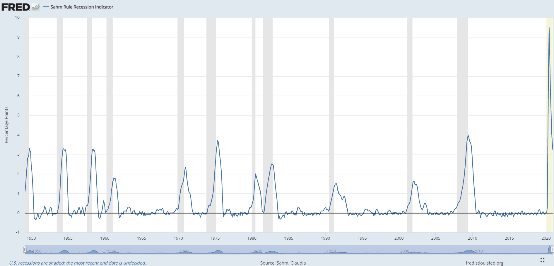 One thing that was apparent was how quickly the economy can change during a recession, especially when you have mass interventions by the Fed and Congress. The issue was how do we MECHANICALLY identify a recessionary environment in order to adjust the model to a simulative environment. Last fall I was reading a lot of different Fed research pieces and saw several mentions of the "Sahm" rule. It is named after Claudia Sahm, an economist at the Federal Reserve who proposed a mechanical way of identifying a recession more quickly.