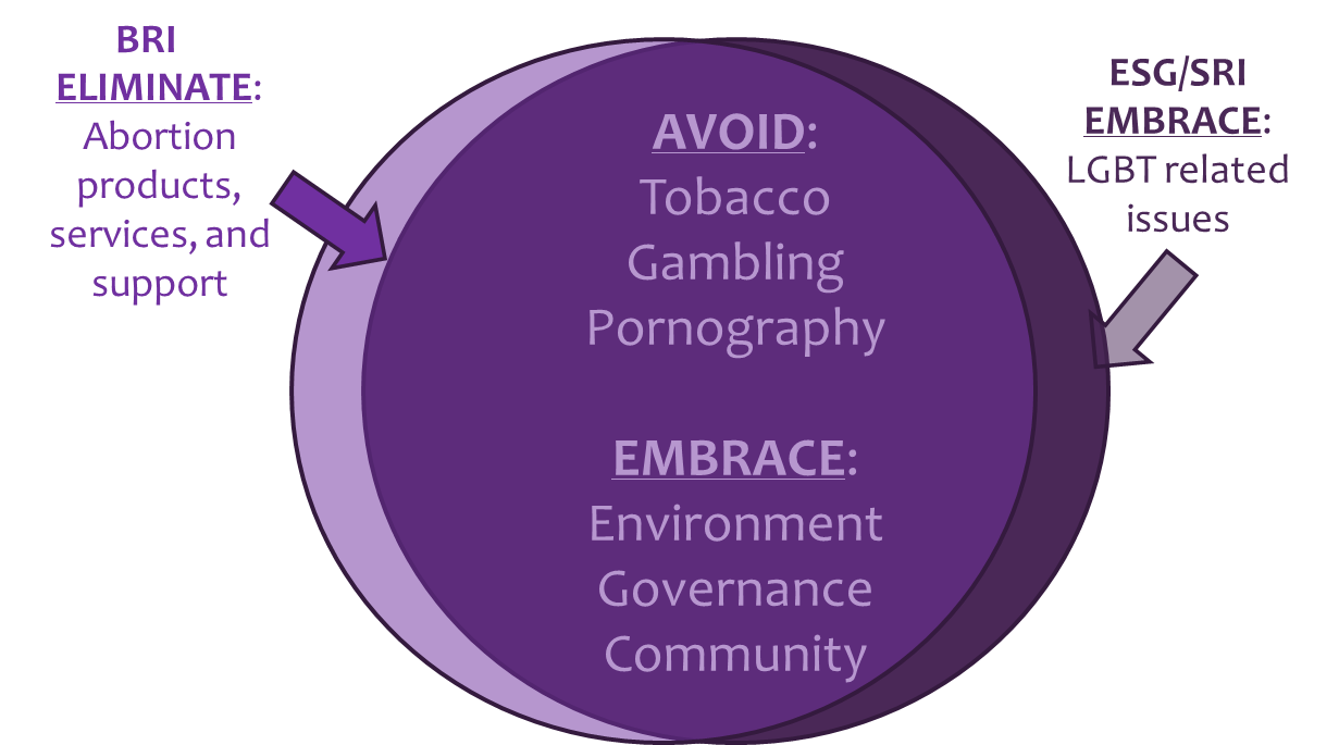 A lot of times Biblically Responsible Investing is tied with Socially Responsible Investing (SRI). While there are some similarities in the sense that both have screening criteria, they both have different types of screens. SRI generally focuses on environmental stewardship, consumer protection, human rights, and diversity. BRI tends to have stricter screening criteria which focuses on things in the Bible – avoiding things that the Bible is against and promoting companies that care about making the world a better place. Below is a Venn diagram we use to show some of the differences between BRI and SRI.