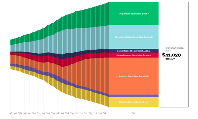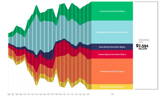 The Federal Reserve has been the great enabler of all this debt. Not only did they push interest rates low and allow companies to borrow at rates far below where they should have been, they created so much liquidity at the same time they bought up most of the stock of Treasury Debt, fixed income investors had no other place to go. Here’s a look at bond market issuance through 2017. The total issuance was a new record, and was gobbled up in part thanks to the strong demand for debt from the insurance companies selling fixed products.
