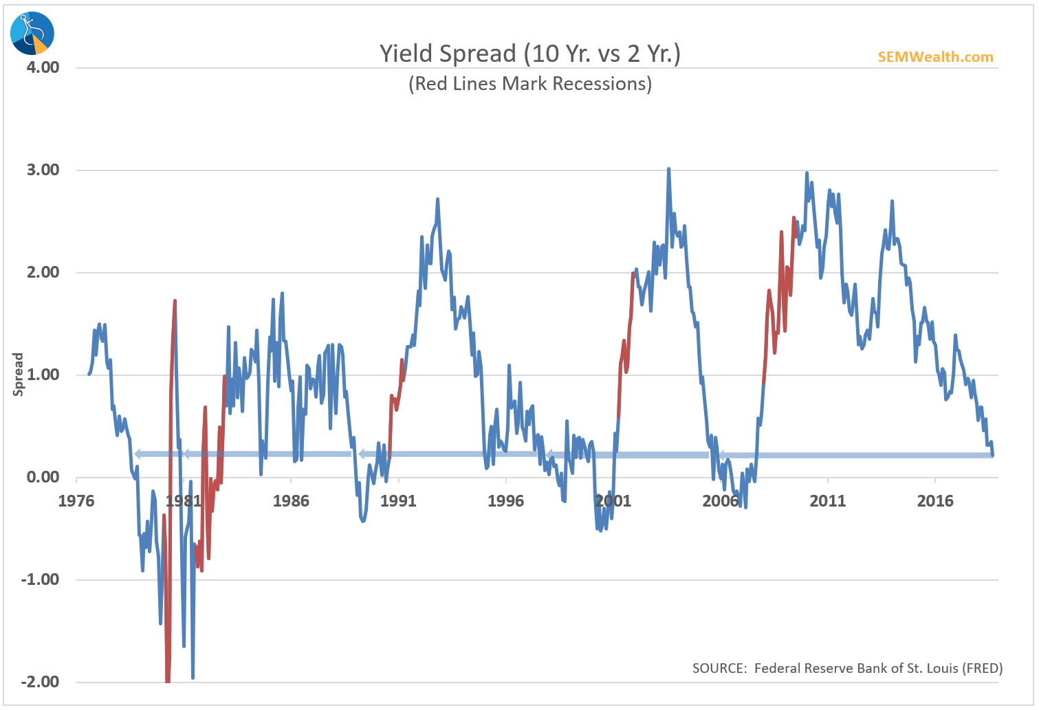 Ignoring all the noise, there is certainly cause for concern. I’ve found the spread between the 10-year Treasury bond and the 2-year Treasury bond to be the best portion of the yield curve in predicting recessions. It is heading lower rapidly as this week’s Chart of the Week highlights. One thing you will notice is how early the spread turns negative ahead of the recession. It has turned negative ahead of all 5 recessions. The average lead time is 17 to 21 months between the first month it turned negative and the start of the recession. While it has not yet inverted, it is getting precariously close to that level.
