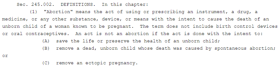 Many people are saying that women in states that ban abortion will not be able to get treatment for ectopic pregnancies and miscarriages. Where does it say that? Check the actual laws for those states that state women won't be helped in emergency situations. Here are some laws that specify what abortions are and what things are still allowed: