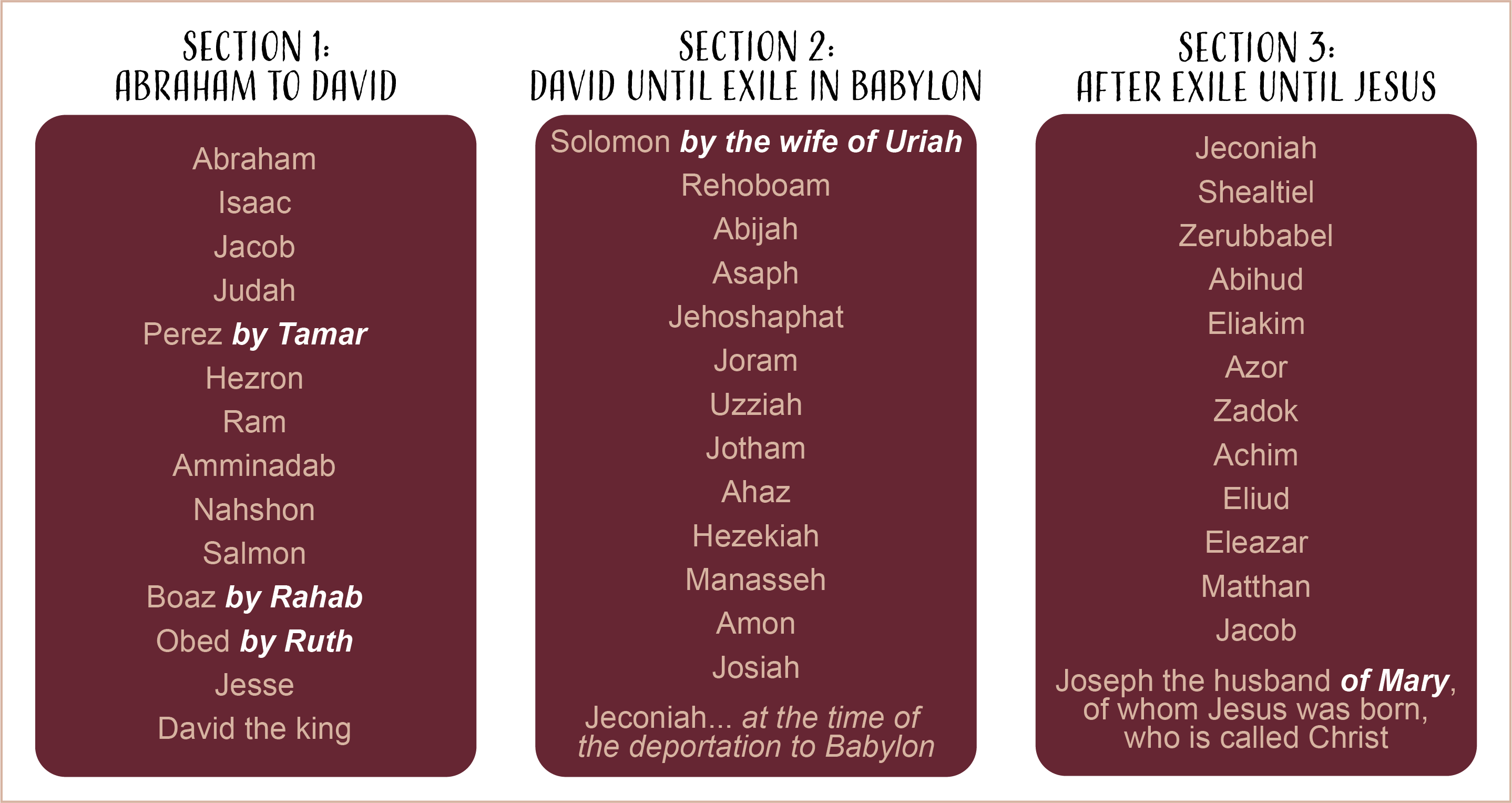 - Tamar (v. 3), Rahab, and Bathsheba ("the wife of Uriah" v. 6) were all women of questionable character