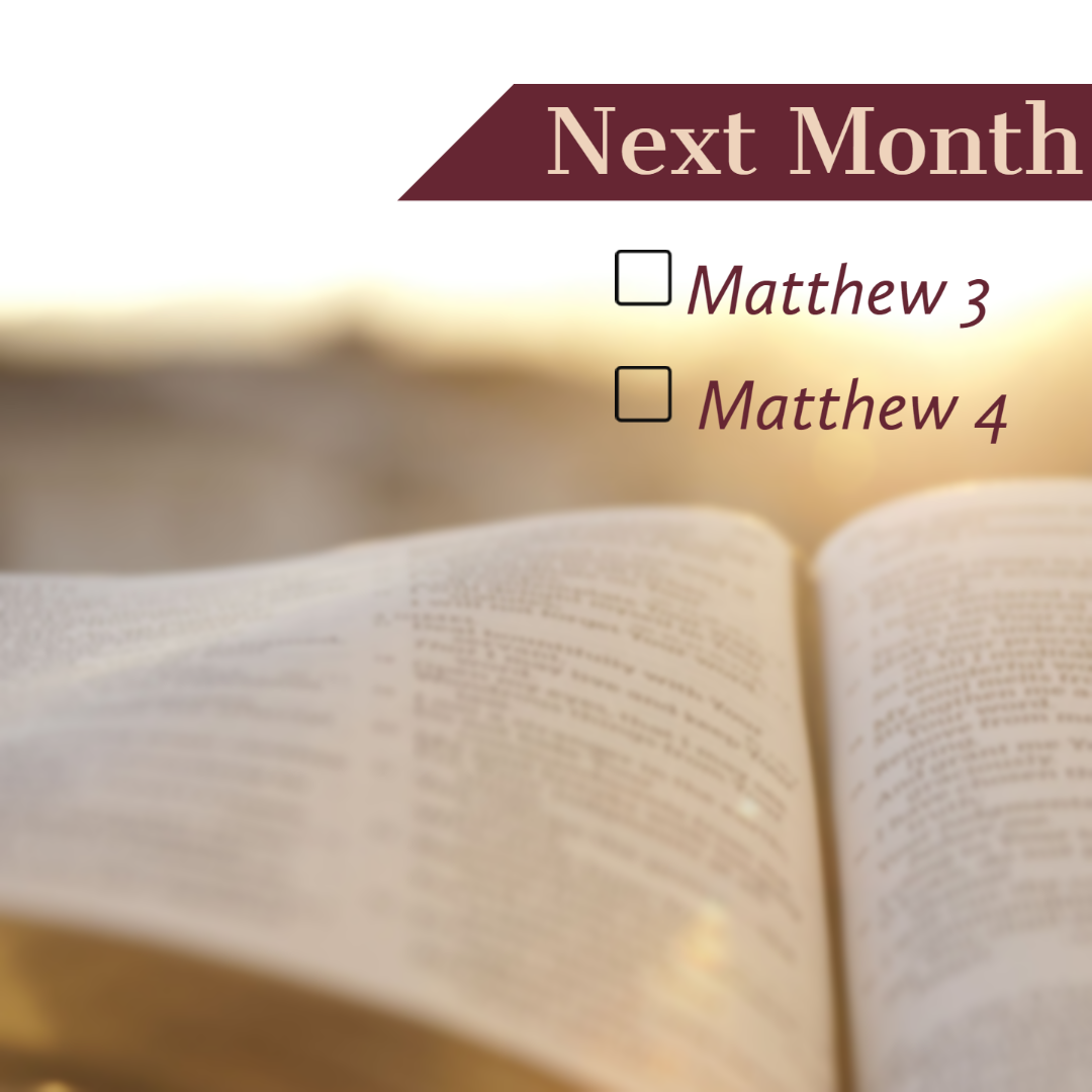 At the end of chapter 2, we see that Joseph goes to Nazareth with Mary and Jesus after King Herod's death. Next month, we're going to jump into Matthew 3 and 4 which jumps to the beginnings of Jesus' ministry.