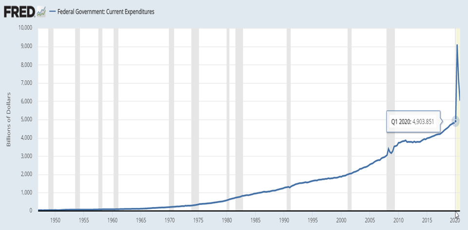 Like the Fed, Congress brought a new level of support during the pandemic. I marked on this chart the pre-pandemic spending level for reference.