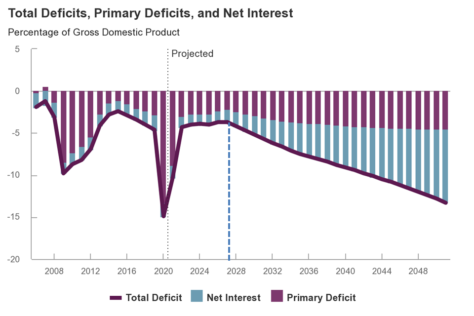 This chart from the CBO shows when the deficit will start to matter. Note in 2028 under current spending levels (ignoring the Biden administrations $3+ Trillion of planned spending–so far) interest expenses begin to become a problem.