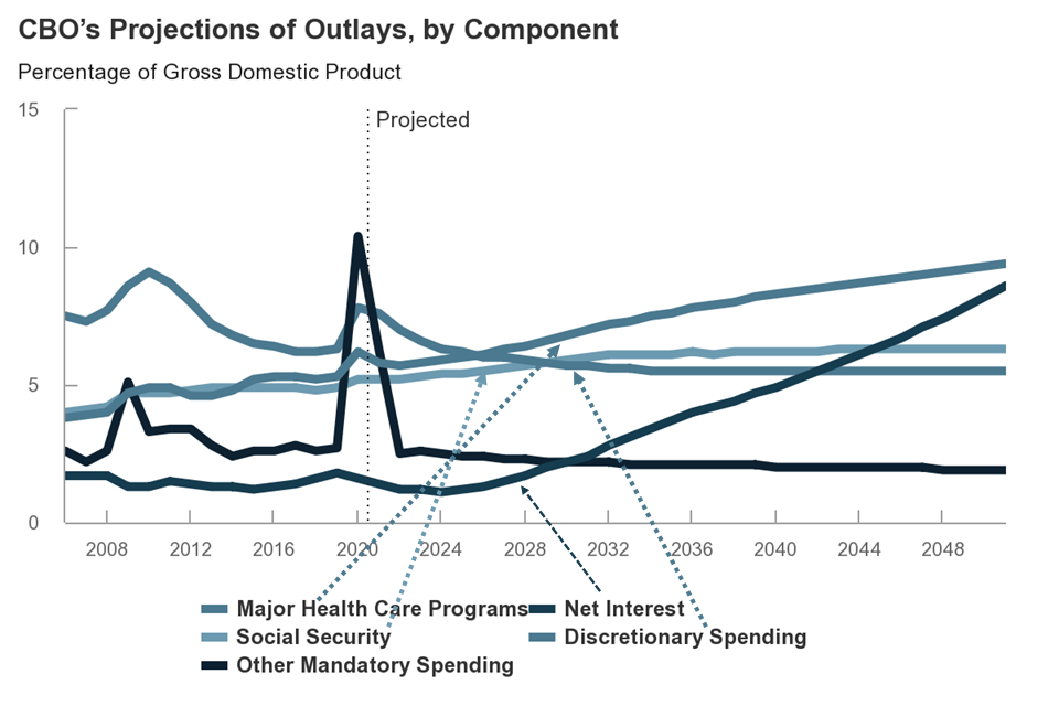 We're about to spend a whole lot of money on health care for older Americans. Social Security spending should level off in the next 10 years, but is still a large amount. In economic terms, both are a drag on economic growth, as is Interest on our debt. This is a serious STRUCTURAL issue that must be solved. Stocks are pricing in "average" long-term growth. These spending projections point to an environment that will be well below average.