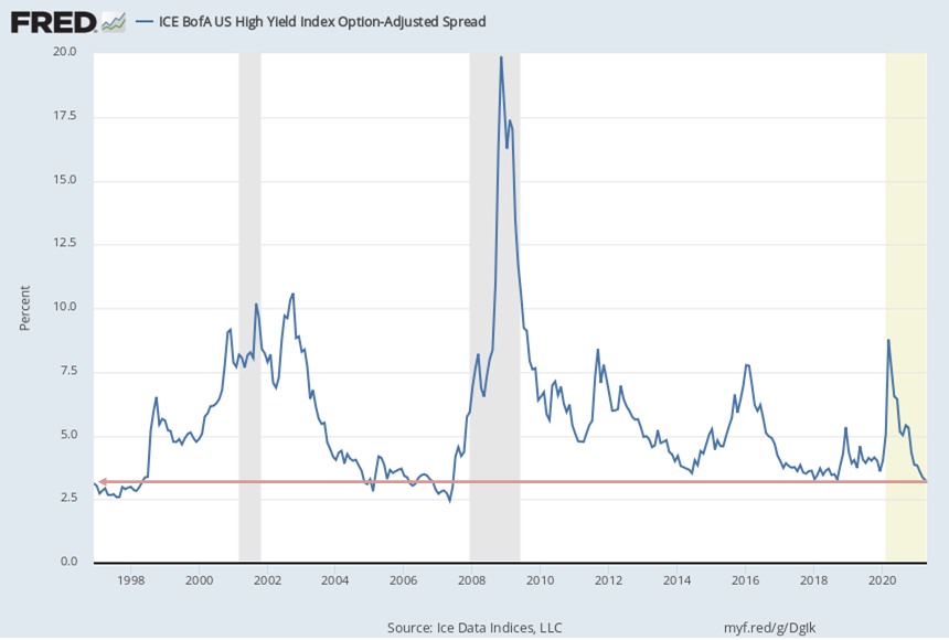 Let's start in the bond market, where valuations can be measured by the difference in yields versus Treasury Bonds. While not quite at a record, we are certainly near the lows of the cycle.