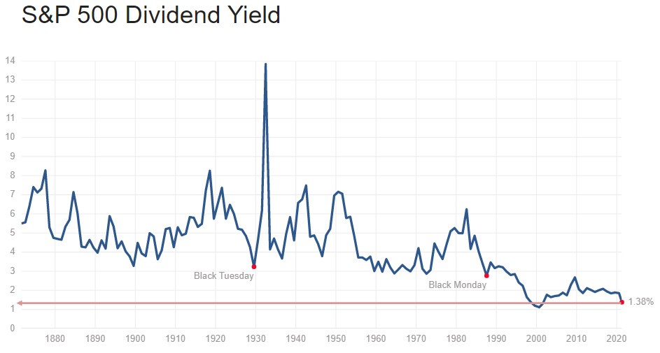 I've heard too many times people saying, "with bond yields so low, you should buy dividend stocks." This is TERRIBLE advice! Even if you ignore the fact dividend stocks have historically lost more money than the S&P 500 during bear markets, the current dividend yield is close to a record low. The only time it was lower was at the end of the tech bubble.